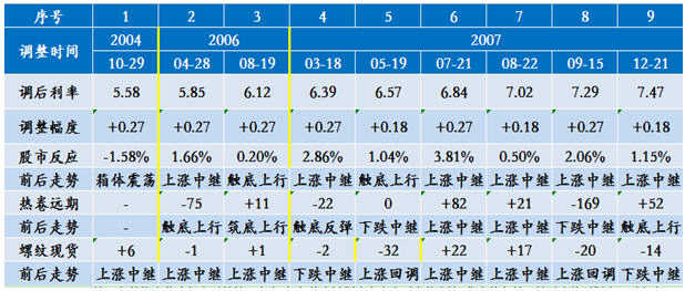 從上世紀90年至今有兩個加息周期,一個是1991年4至1995年7月,另一個是2004年10至2007年12月。短中長期利率都進行了上調,幅度在18點、27點不等。