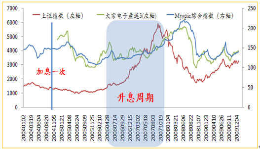 圖表5 2004年-2007年加息后的股市和鋼市走勢