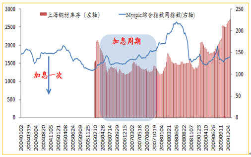 圖表8 鋼材庫存、鋼價與加息的關系